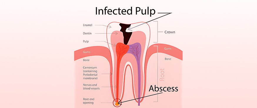 It is a procedure which involves removal of infected pulpal tissue situated inside the root portion of a tooth. After numbing the concerned area with local anaesthetic your dentist will remove the infected pulp, then the chamber is thoroughly cleaned and shaped. Now the empty pulp chamber is restored with biocompatible medicated filling material and an adhesive cement.